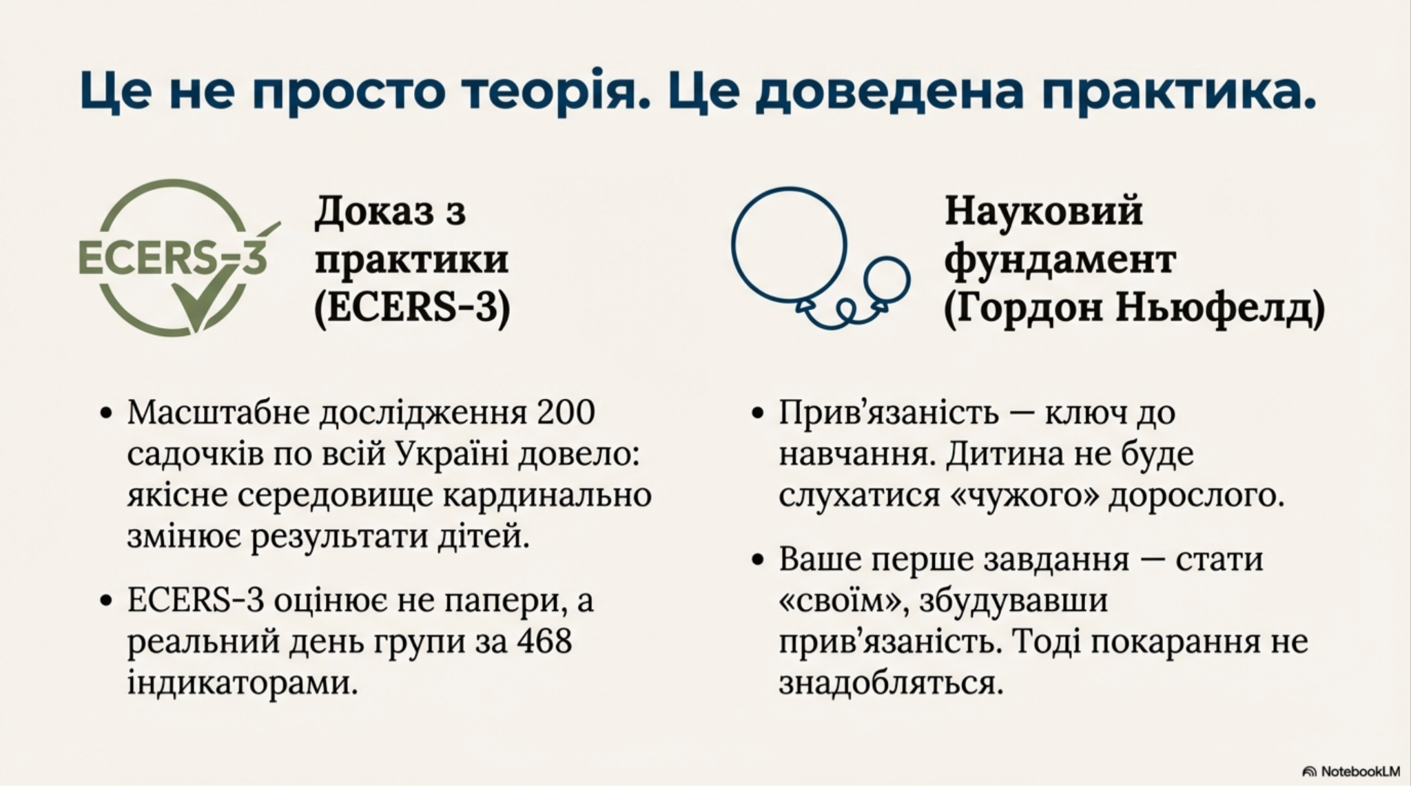 Можна подумати, що все це — просто красиві теорії для ідеального світу. Але в Україні вже відбулися масштабні дослідження за методикою ECERS-3, які довели: якісне середовище кардинально змінює результати дітей. У 2021-2022 роках було оцінено 200 садочків по всій країні. Виявилося, що навіть у сільській місцевості можна досягти високих балів, якщо педагог розуміє свою роль як архітектора середовища.