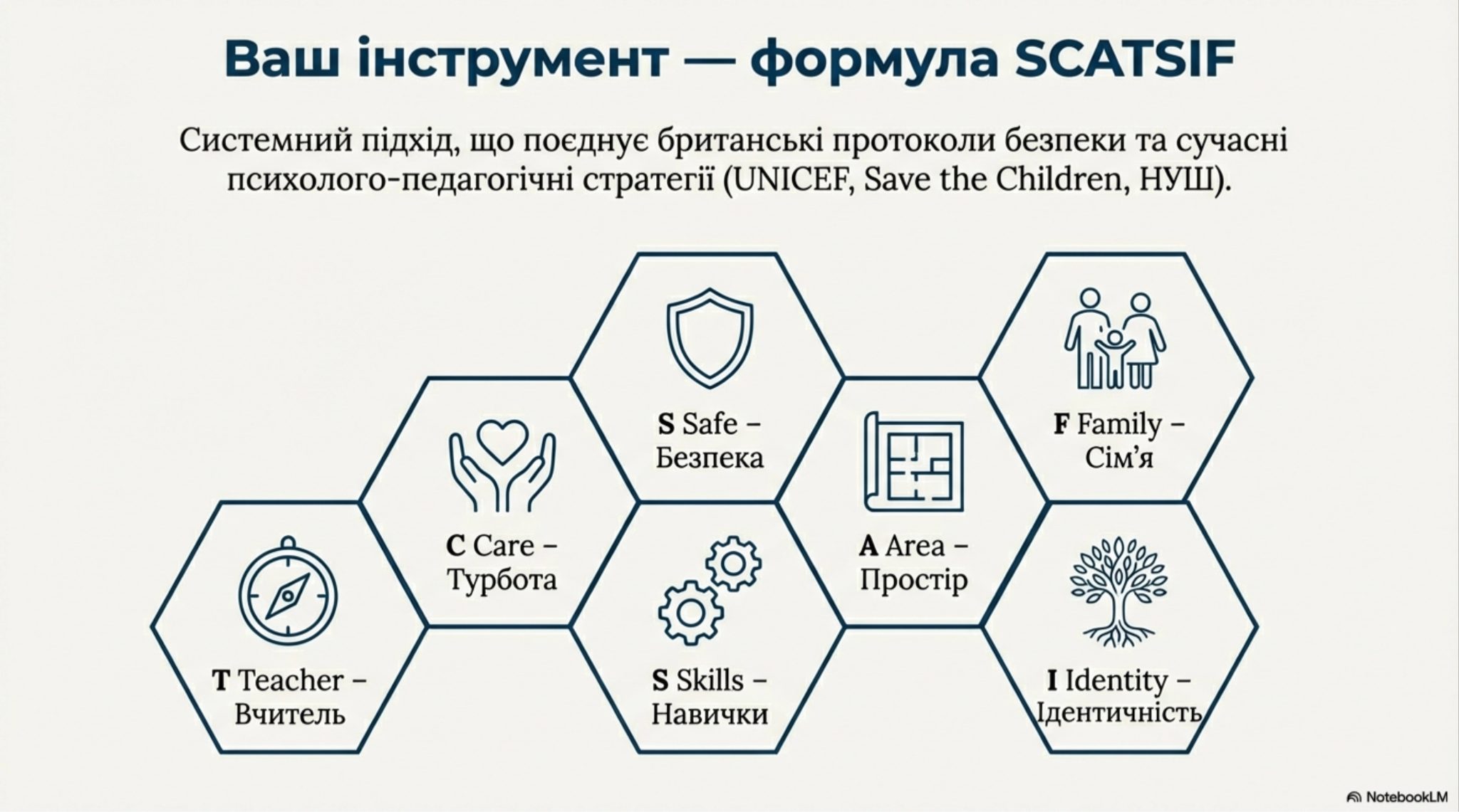 Формула SCATSIF є синкретичною моделлю. Вона поєднує в собі західний структурний підхід до управління ризиками (адаптація британських протоколів безпеки) із сучасними психолого-педагогічними стратегіями життєстійкості, що розроблені під егідою міжнародних організацій (UNICEF, Save the Children) та адаптовані українськими методистами для потреб Нової української школи (НУШ) в умовах воєнного стану. Якщо цікаво, шукайте посібники з «Психосоціальної підтримки вчителів та учнів» за 2022 рік — саме тоді стався перехід від суто "рятувального" значення до "педагогічного".