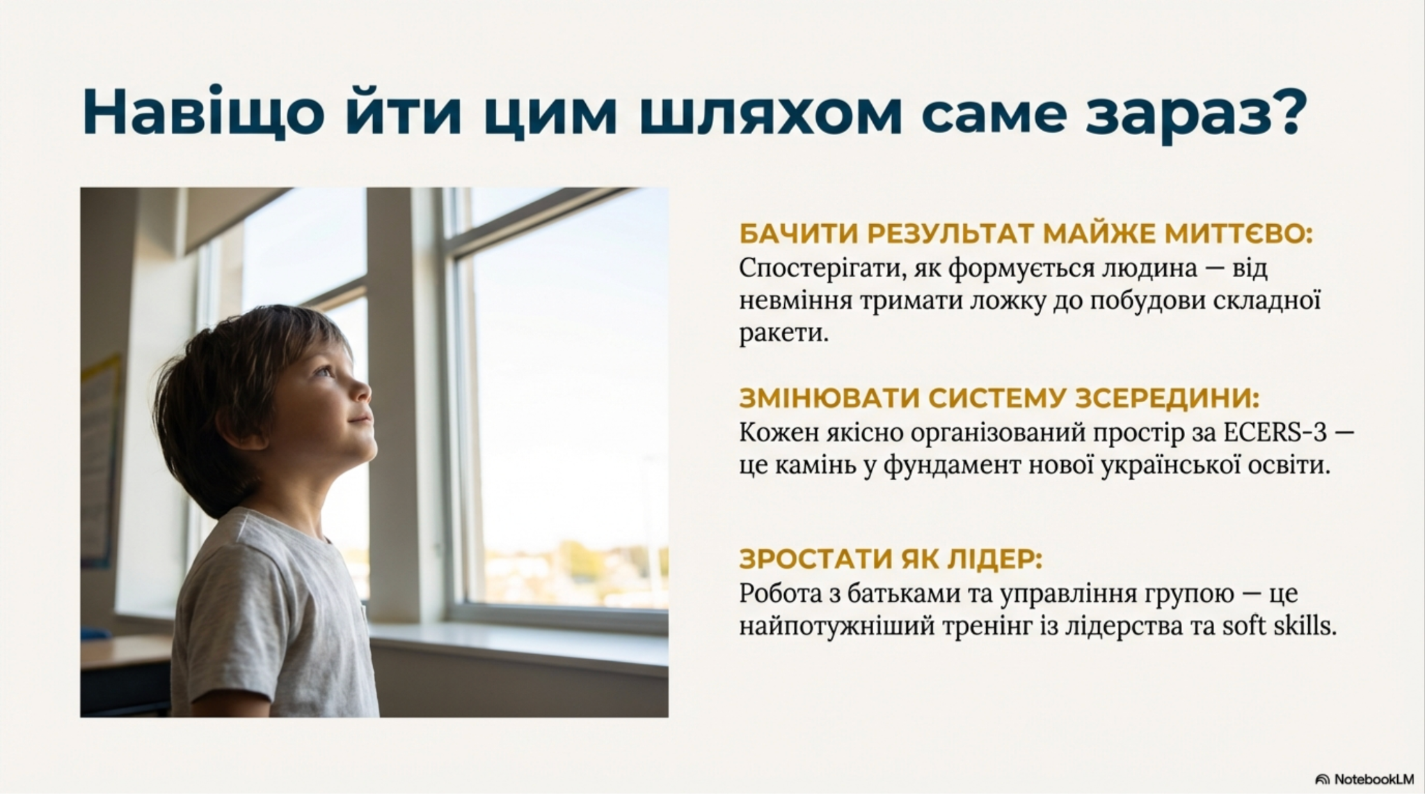 Змінюєш систему зсередини. Кожен якісно організований простір за ECERS-3 — це камінь у фундамент нової української освіти.
