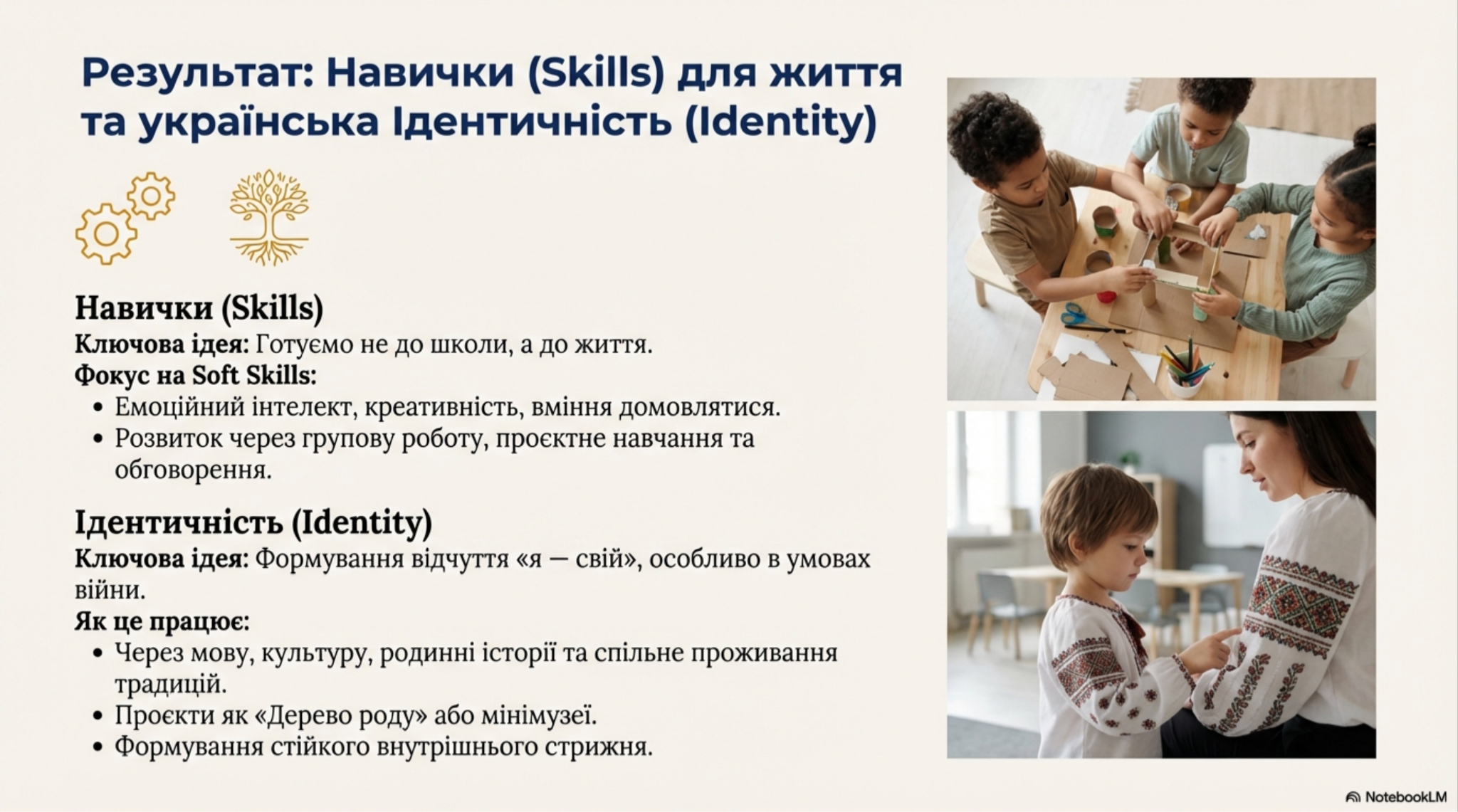 В умовах війни національна ідентичність стала питанням виживання нації. Але для дошкільника ідентичність — це не політичні гасла. Це відчуття «я — свій», «тут мій дім», «моя мова — це красиво». Архітектор дошкілля впроваджує ідентичність через родинні історії, через спільне проживання традицій та ритуалів. Сім’я тут є головним партнером. Через спільні свята, проєкти «Дерево роду» або мінімузеї на кшталт «Родинні традиції групи» ми формуємо стійкий внутрішній стрижень дитини.