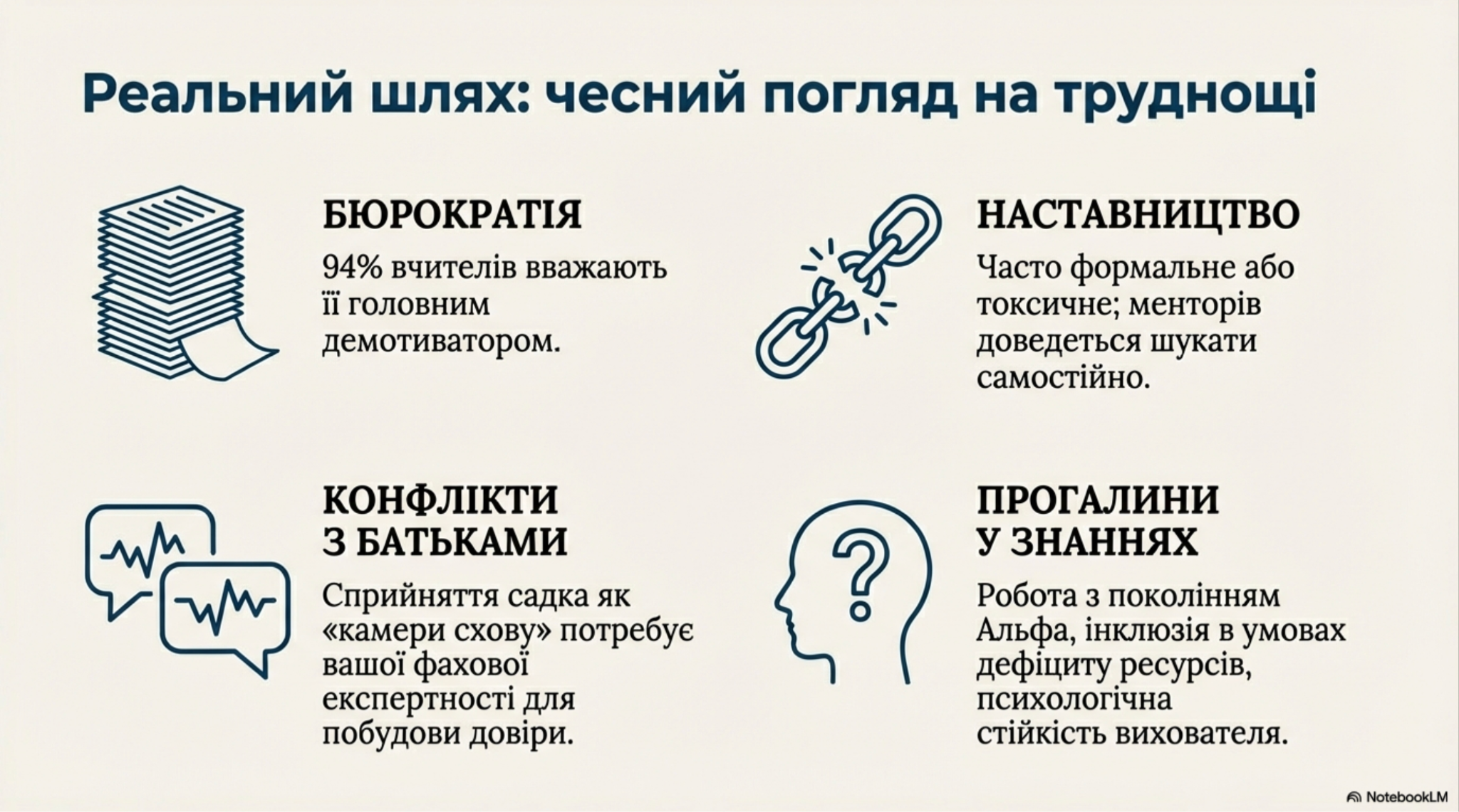 Друге — формальність наставництва. Майже половина молодих вчителів кажуть, що наставника їм не призначали, а якщо він і був, то допомагав формально чи навіть токсично («тиснув авторитетом»). Тобі, в більшості випадків, доведеться шукати менторів самостійно, можливо, поза межами свого садочка — у професійних спільнотах чи на онлайн-платформах.
