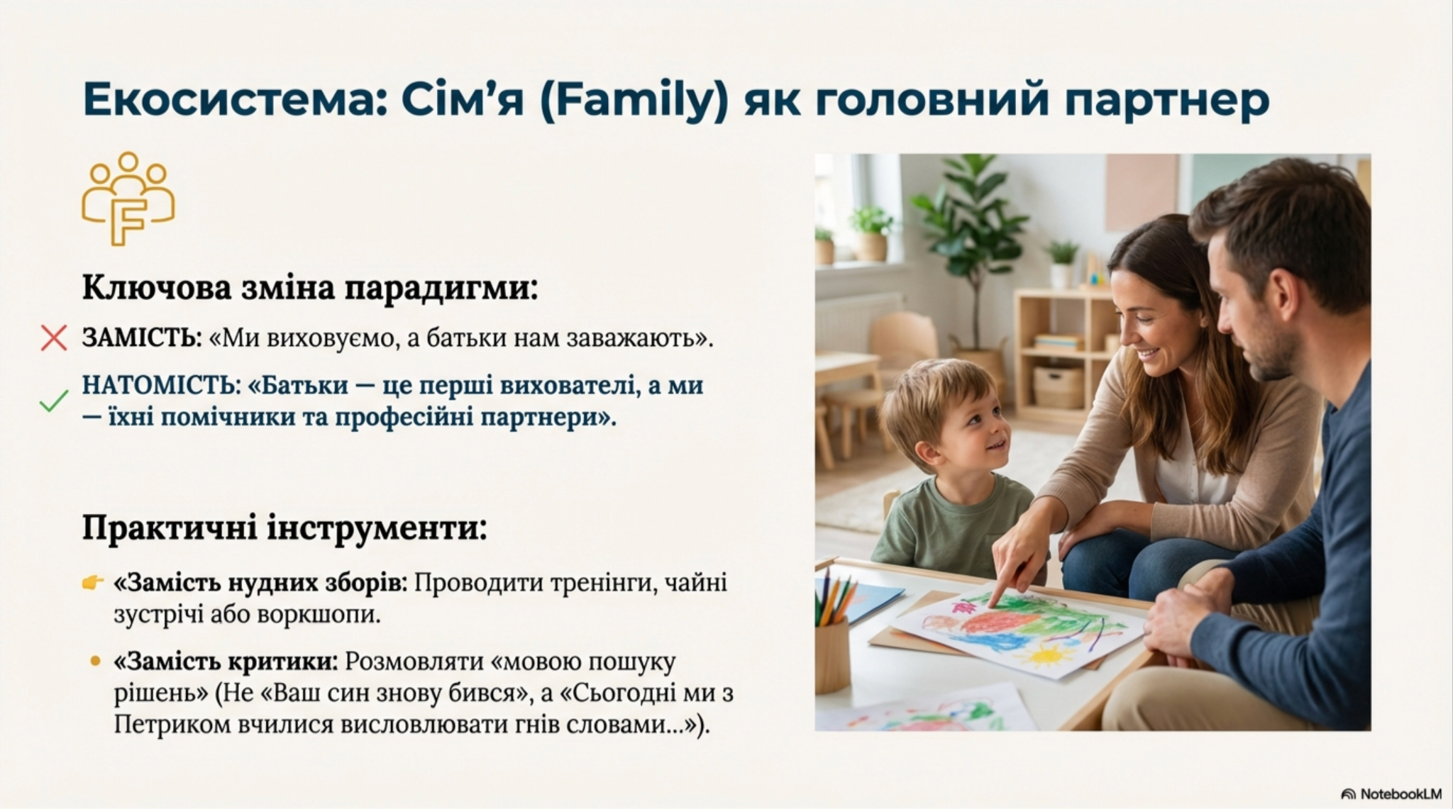 Стара школа казала: «Ми виховуємо, а батьки нам заважають». Сучасна архітектура дошкілля каже: «Батьки — це перші вихователі, а ми — їхні помічники та професійні партнери». Ти маєш стати посередником між сім’єю та дитячим колективом.