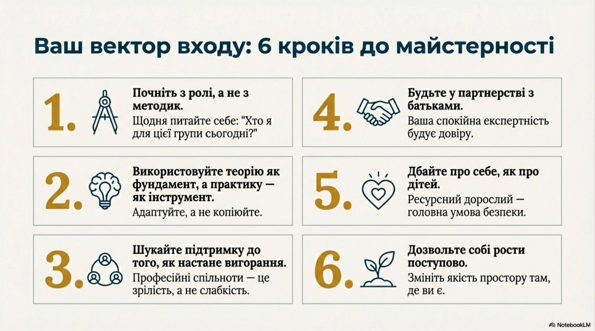 Якщо ти на початку шляху — не намагайся стати «ідеальним вихователем» одразу. Ця професія не про швидкість, а про глибину.