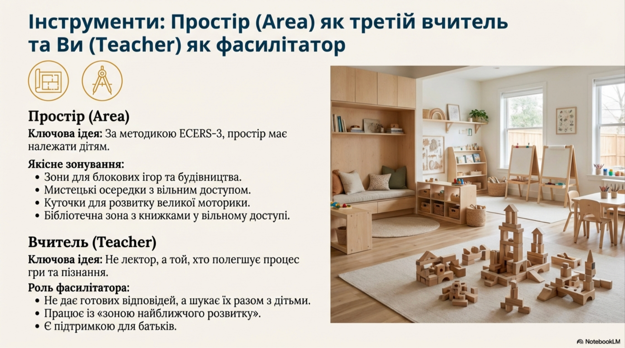 Ти — дизайнер середовища. За методикою ECERS-3, простір має належати дітям. Це означає, що ти маєш створити простір групи, прилеглих кімнат, коридору так, щоб вони відповідали інтересам та потребам дитини, ігри та матеріали були безпечні та в доступі.