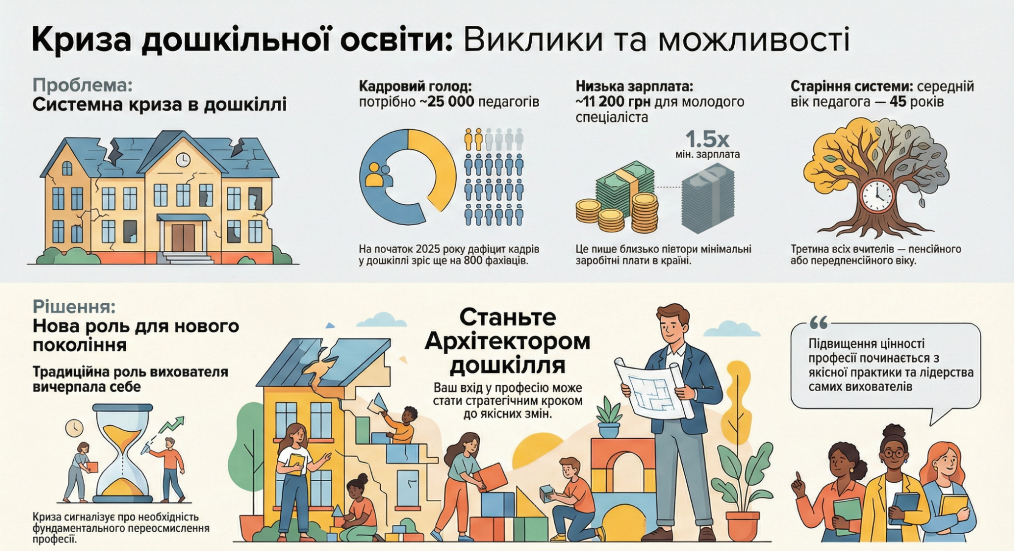 Сьогодні дошкілля опинилось на перетині кількох серйозних викликів - кадрових, соціальних та професійних. Ми маємо гострий дефіцит кадрів: офіційні дані Державної служби статистики та Центру зайнятості свідчать, що у 2024 році потреба в педагогах становила близько 25 000 осіб. Станом на початок 2025 року брак кадрів зріс на іще півтори тисячі, з яких 800 — саме в дошкільній ланці. Це свідчить про високу потребу системи у нових фахівцях і підтримці кадрового оновлення. Але чому твої однокурсники не поспішають у професію?