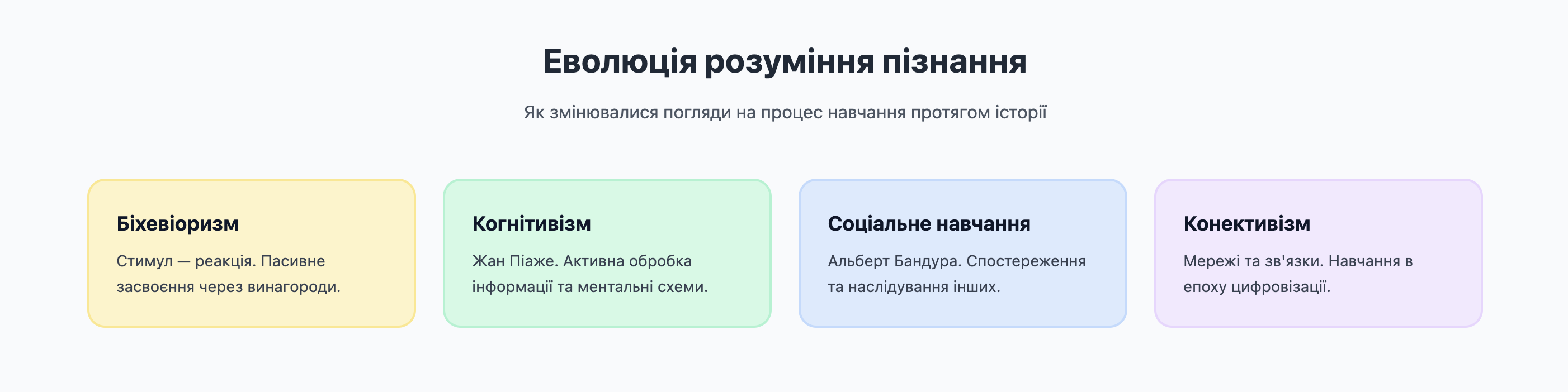 Сучасні підходи до навчання розширюють це розуміння. Теорія соціального навчання Альберта Бандури підкреслює, що індивіди вчаться не лише через власний досвід, а й через спостереження та наслідування інших, а також через підкріплення та покарання. Це акцентує увагу на соціальному аспекті навчання, показуючи, що воно є не лише індивідуальною, а й колективною діяльністю. В епоху цифрових технологій з’явився конективізм — теорія, яка підкреслює важливість мереж і зв'язків у навчанні. Вона звертає увагу на зміну природи знань і способи, якими люди отримують доступ до інформації та використовують її, що демонструє постійну еволюцію пізнавального процесу.
