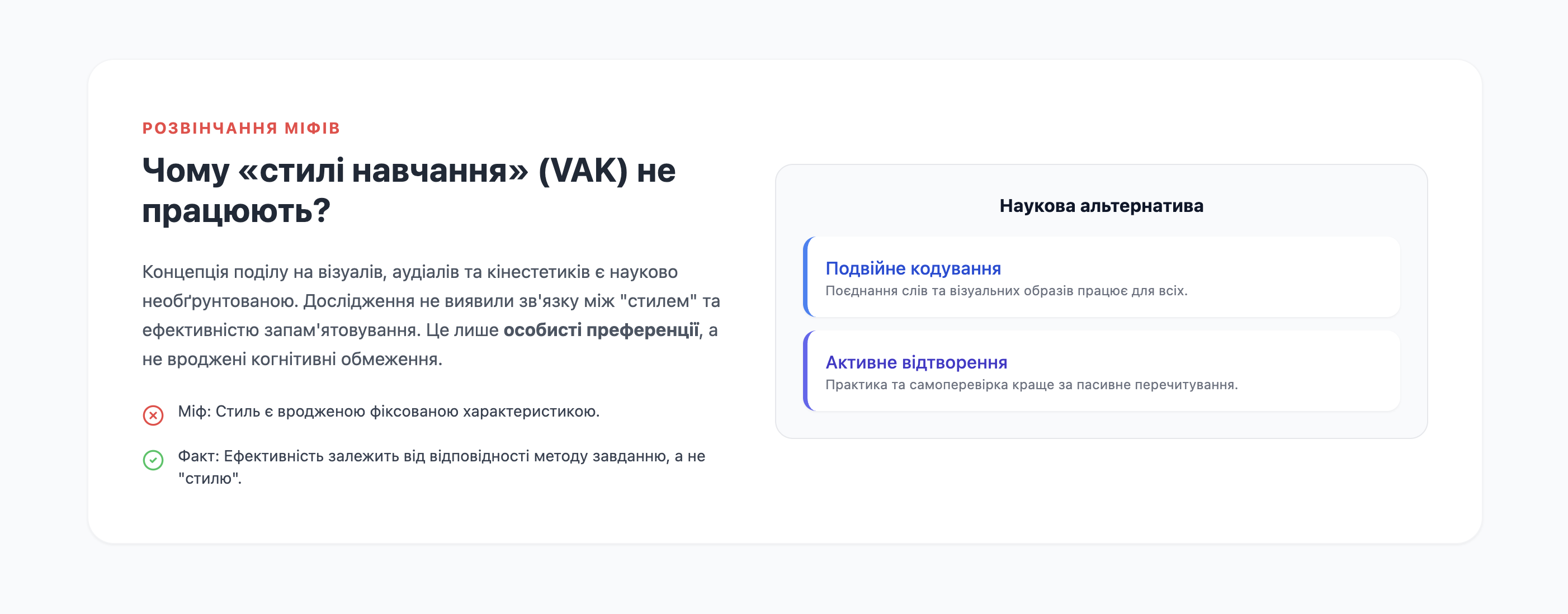 По-перше, популярна концепція "стилів навчання" є міфом, що не має наукового підтвердження, і може обмежувати потенціал людини. Набагато ефективніше розглядати свої сильні сторони через призму теорії множинного інтелекту, що дозволяє обирати найбільш підходящі методи та контексти для засвоєння інформації.
