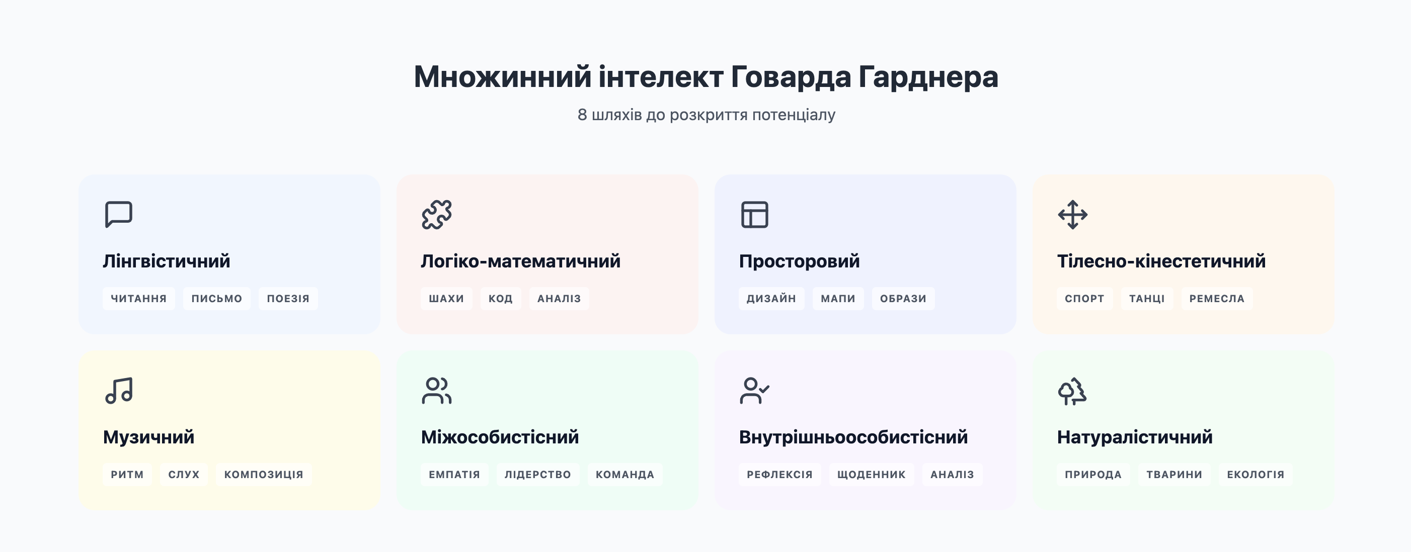 Як теорія множинного інтелекту Гарднера допоможе підвищити ... https://osvitanova.com.ua/posts/4772-yak-teoriia-mnozhynnoho-intelektu-hardnera-dopomozhe-pidvyshchyty-motyvatsiiu-dytyny-do-zasvoiennia-novykh-znan